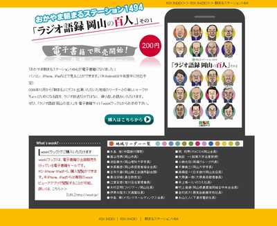 山陽放送ラジオ「朝まるステーション1494」には2009年10月から毎回地域のリーダーが出演、ニュースや地域の動きについてコメントする他、楽しいトークで、ちょっと為になるお話を繰り広げています。リスナーにラジオ放送を提供するだけでなく、番組放送後でも繰り返しお読みいただけるように本サービスを企画、通常の紙の本での出版ではなく、インターネットを介して多くの人にお伝えできる『電子書籍』としての出版をすることになりました。電子書籍の作成から販売まででき、自社専用の書籍紹介サイトの開設もできる機能など、電子出版に必要な機能をオールインワンで搭載し、手軽かつスピーディに電子出版ビジネスを始めることができる「wook」を評価していただき、このたびの「ラジオ語録 岡山の百人」の電子書籍出版開始となった。