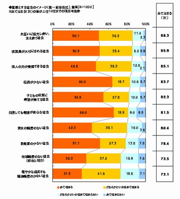 15歳~59歳の男女(全回答者1000名)に、「理想とする社会」のイメージについて聞いたところ、『あてはまる(計)』の値(「あてはまる」、「どちらかといえばあてはまる」の合計)が最も高かったのは、「お互いに協力し合い、支え合う社会」で86.3%、次いで「従業員が大切にされる社会」85.9%、「個人の力が発揮できる社会」85.1%、「犯罪が少ない社会」83.7%、「子供の将来に希望が持てる社会」82.3%、「引退しても老後が安心な社会」81.5%、「男女の格差のない社会」80.4%が8割台で続きました。