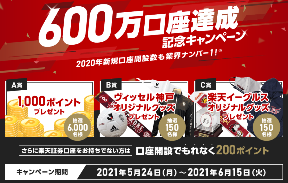 楽天証券株式会社は、証券総合口座が600万口座に到達したと発表し、それを記念してキャンペーンを実施している。