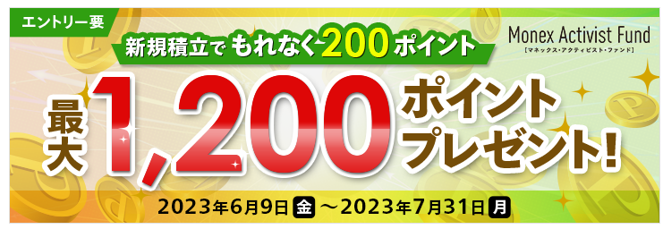 マネックス証券株式会社は、マネックス・アクティビスト・ファンド(以下MAF)の積立した顧客に、最大1,200ポイントプレゼントするキャンペーンを7月31日(月)まで実施している。