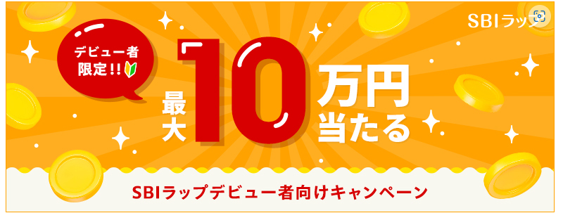 株式会社SBI証券は、「最大10万円当たる!SBIラップデビュー者向けキャンペーン」を、11月30日(木)まで実施している。