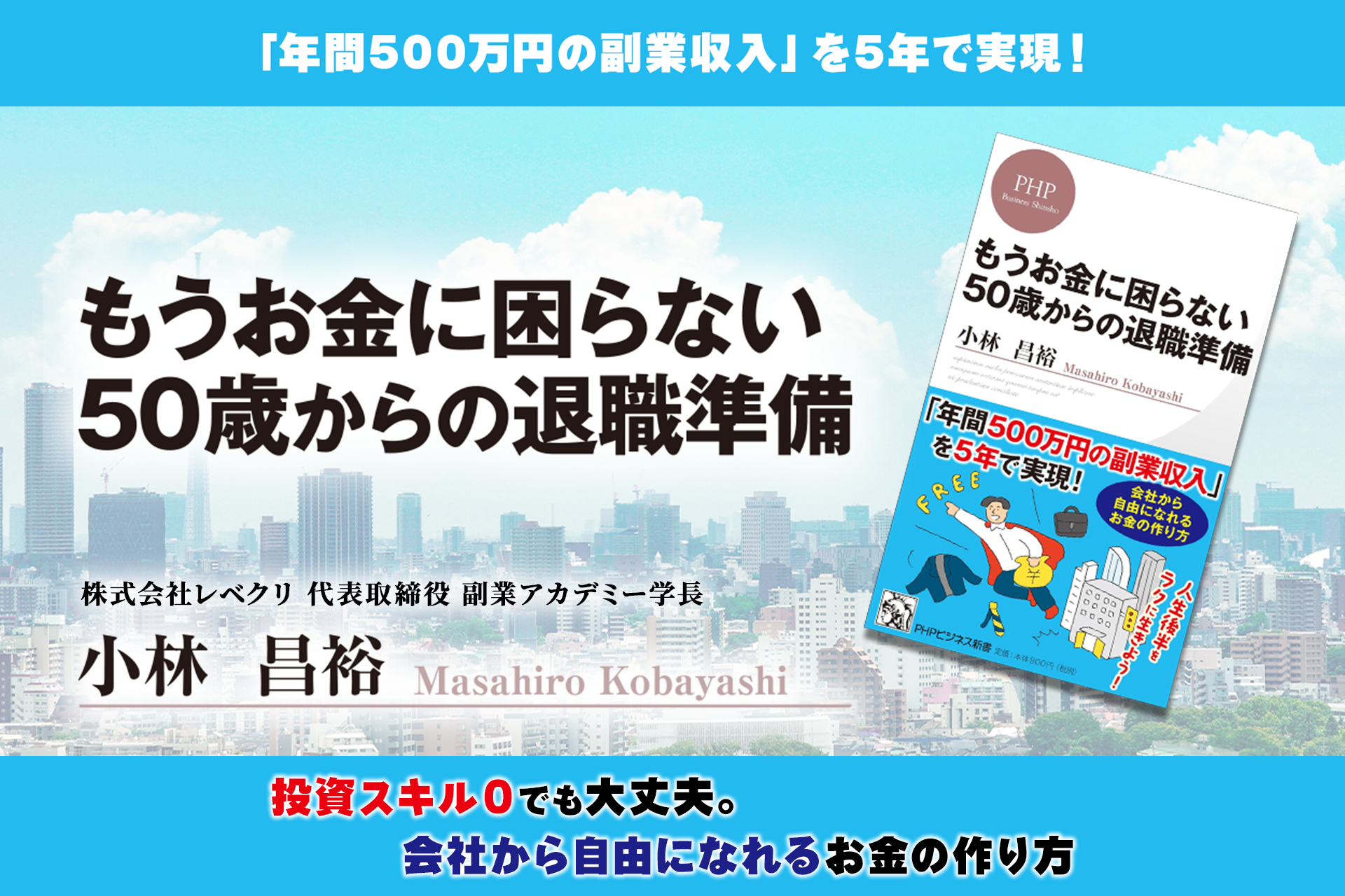 ⽇本初の副業の専⾨スクールとして様々な副業が学べる講座を提供する副業アカデミー代表取締役 ⼩林昌裕が、12月15日(金)にPHPビジネス新書『もうお金に困らない50歳からの退職準備』を刊行した。