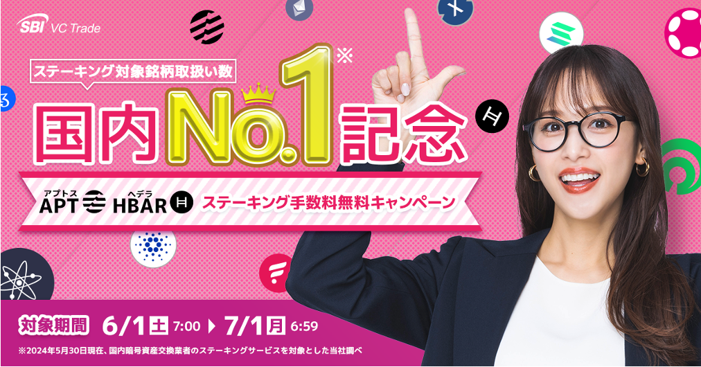 SBI VCトレード株式会社は、6月1日(土)より、「【ステーキング対象銘柄取扱い数 国内No.1記念】アプトス(APT)・ヘデラ(HBAR)ステーキング手数料無料キャンペーン」を、実施している。