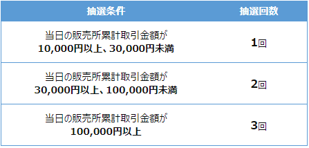 キャンペーン期間中、当日の販売所累計取引金額に応じて抽選に参加できる(獲得した抽選回数は、当日のみ抽選可能)。